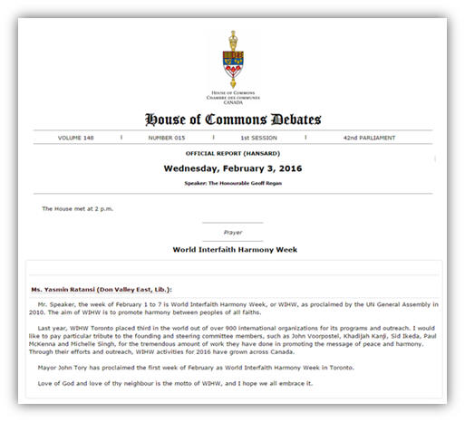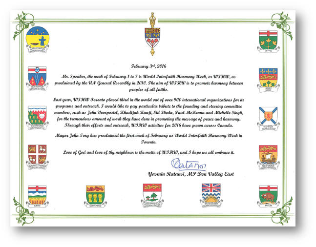 Who Are We, And What Do We Do? Based The Common Word Initiative, World Interfaith Harmony Week was first proposed to the UN General Assembly on September 23, 2010 by H.M. King Abdullah II of Jordan. Just under a month later, on October 20, 2010, it was unanimously adopted. World Interfaith Harmony Week seeks to bring together all people of good will, regardless of faith, to learn about each other and find ways to work together on common agendas. Our Toronto Steering Committee held its inaugural meeting at the offices of the Catholic Diocese of Toronto on October 21 2012, Our first events were organized for World Interfaith Harmony Week 2013 Our third year program was internationally recognized which is a testament to the vibrant interfaith community in the Greater Toronto Area. We are grateful for their continued support and participation. |